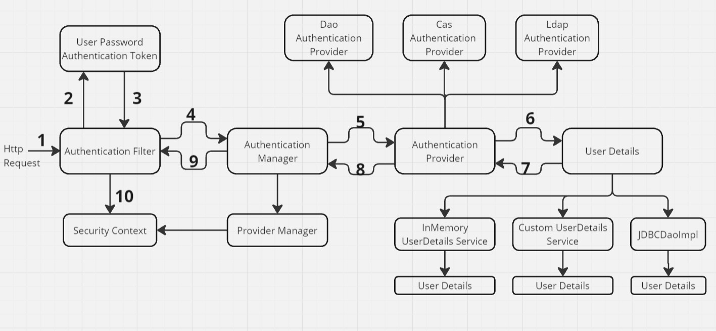 Using the UserDetails service the AuthenticationProvider fetches the User Object corresponding to the username. It fetches this User Object from either a database, internal memory or other sources. This User object credentials are then compared with the incoming Authentication Object credentials. If Authentication is successful then the Principal Authentication Object is returned in response.