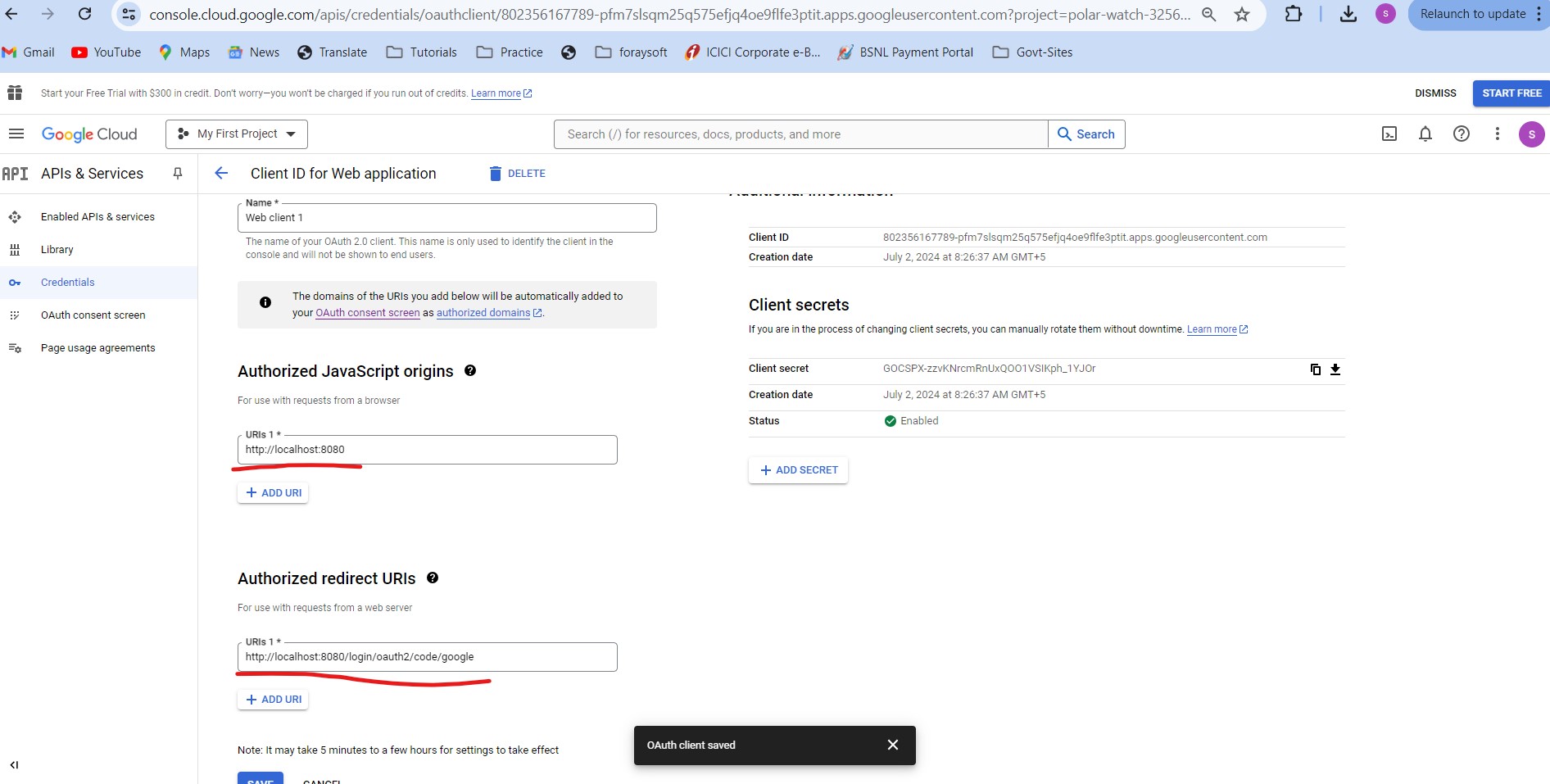 In the above configuration, replace the google-client-id and google-client-secret with the Client ID and Client secret of your app.