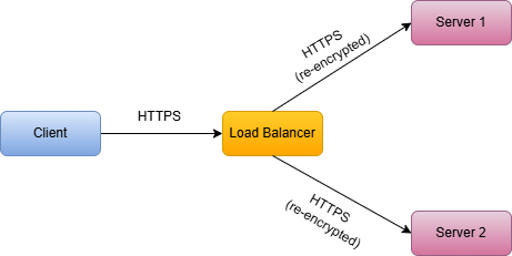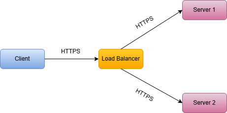 The client connects to the load balancer over HTTPS. The load balancer decrypts the traffic and forwards