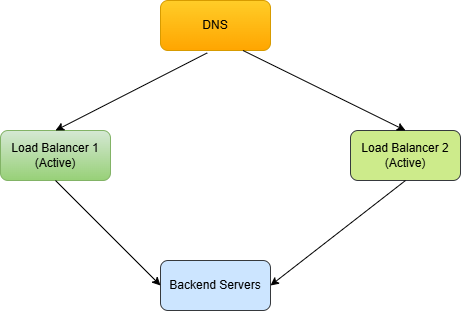In active-active mode, both load balancers handle traffic simultaneously. DNS or an upstream router