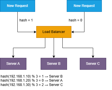 The client’s IP address is hashed to determine which server handles the request. The same client IP always