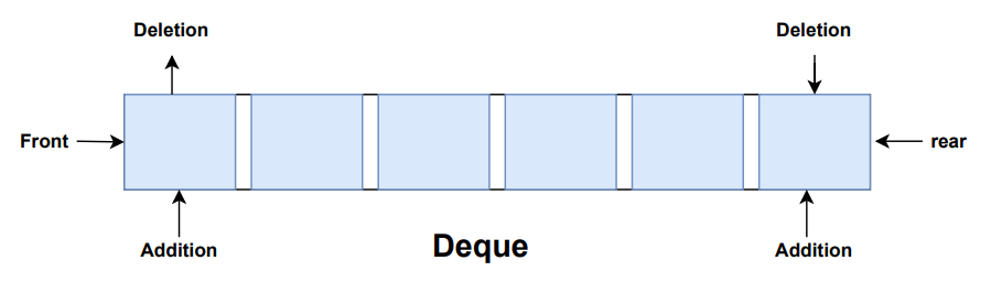 In a regular queue, elements are added from the rear and removed from the front. However, in a deque, we can insert and remove elements from both front and rear.
