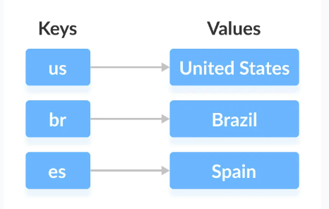 In the above diagram, we have values: United States, Brazil, and Spain. And we have corresponding keys: