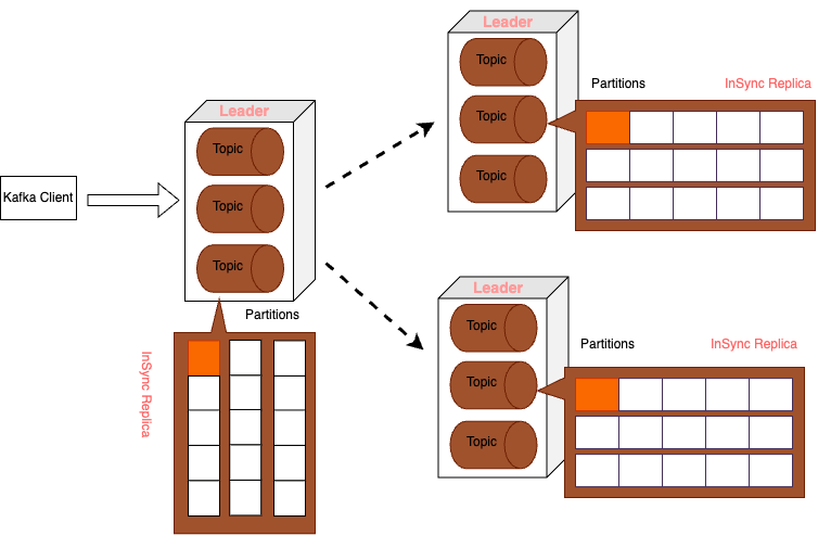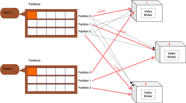 Every Kafka broker can be a leader and a follower at the same time. Let's take a look in the below diagram, on the right side in below diagram we have three kafka brokers Each broker is labeled with node ID and on the left side in the diagram I have two kafka topics that are stored on these brokers.