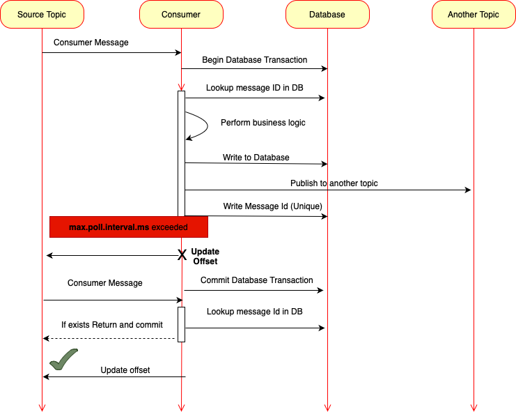 Once Kafka consumer consumes the message, it will first check database to see if message with this message ID was not processed earlier. If message was processed earlier, we will simply return from this method and transaction will complete. But if this message is a new message, then we can perform our business logic, maybe write results back to a database table, and maybe publish event to another Kafka topic. And then at the end we will write unique ID of this Kafka message to a database table. And this will help us remember that this message was processed successfully. If maximum poll interval exceeds, then partition offset will not be committed and Kafka Broker will remove this instance of consumer microservice from consumer group. It will do rebalancing and once that is done, the same message will be consumed again by either another instance of this microservice or by the same instance, but when it rejoins consumer group again. But even though this consumer application was removed from consumer group, the execution of our Java code will continue because there were no exception thrown in our Java code, the started at the beginning transaction.
