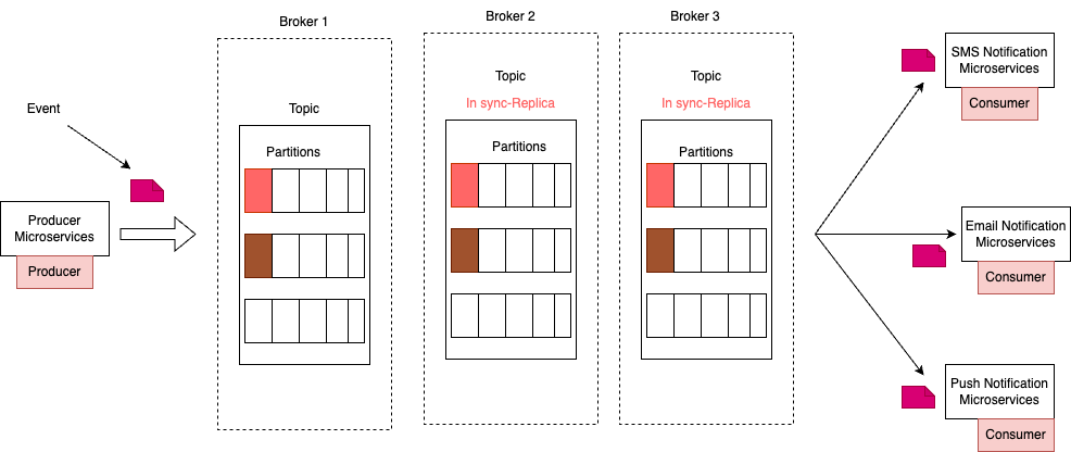 Now inside the topic. Publish events are stored in multiple partitions, and each of these little cells in topic partition stores an event. When a new event gets stored in a topic, it is stored inside of this little cells, and then it gets replicated across multiple Kafka servers. When a new event arrives, it gets stored into a new cell, and then it gets copied over to other Kafka servers.