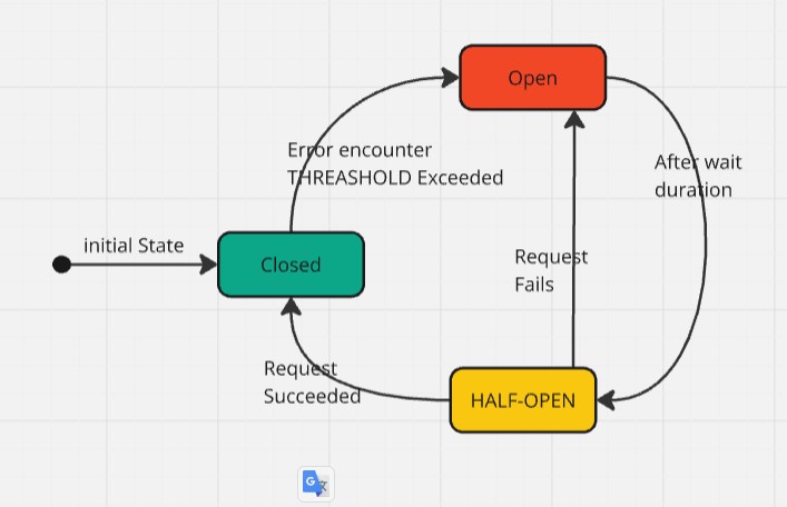 Half-Open: Once the timeout or reset interval passes, the circuit breaker goes to the “Half-Open” state. It allows a limited number of test requests to pass through to the service to see if the service has recovered or not. If the test requests succeed, it means the service has recovered and the circuit breaker goes back to “Closed” state. If any of the test requests fails, it means the service has still issues and the circuit breaker goes to “Open” state to block further requests.