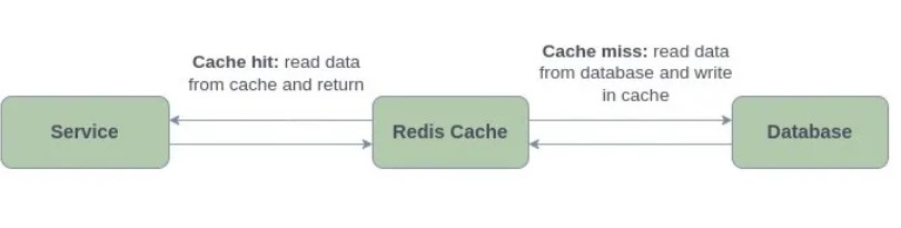 When a request is made, the service initially looks in the Redis cache for the desired data. When a cache hit occurs, the data is retrieved from the cache and provided back to the service, avoiding the need to interact with the database.