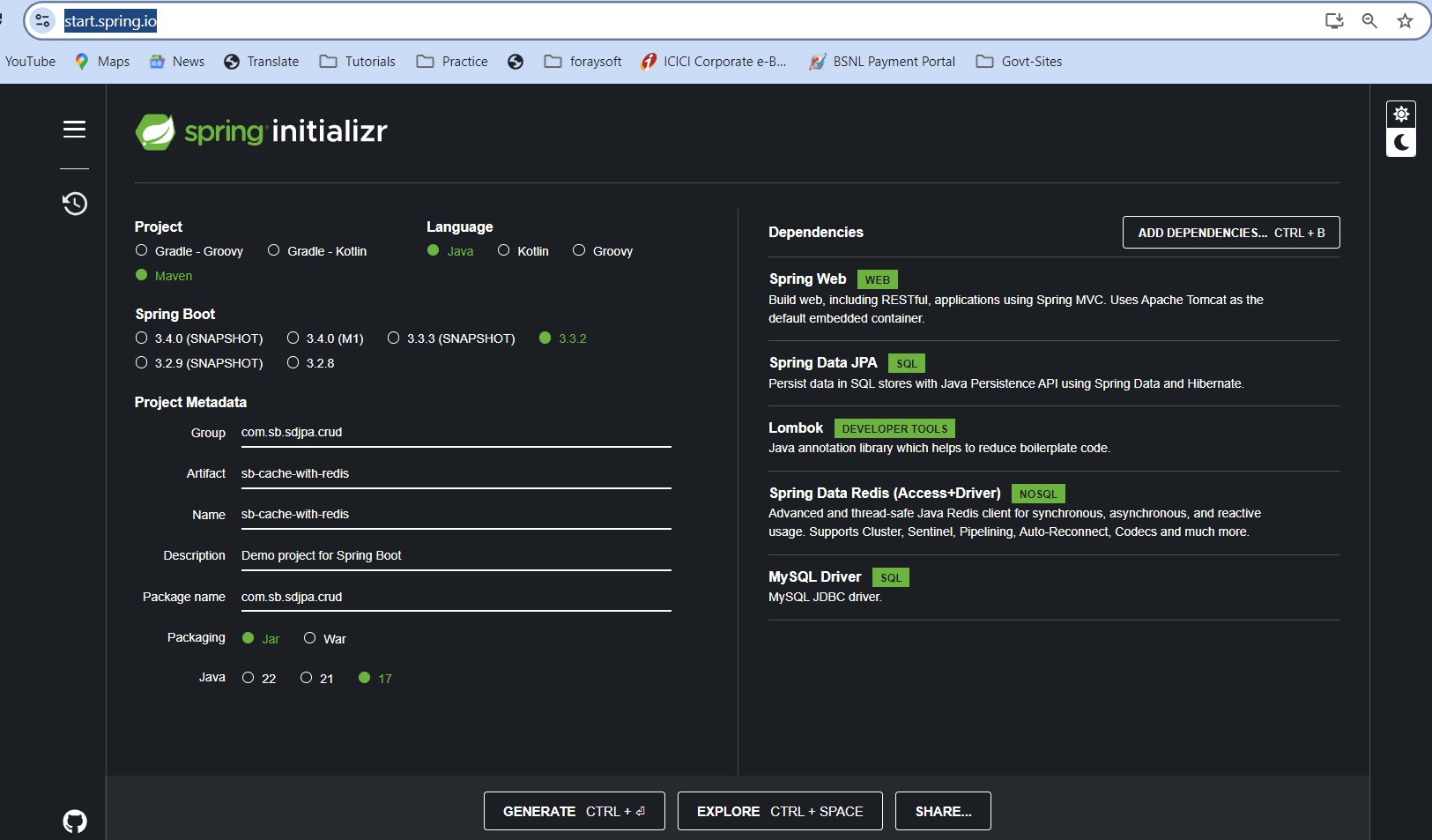 While creation of the project we have selected the SpringData Redis library. If we're making changes in the existing project or service we need to add below dependency in pom.xml file.