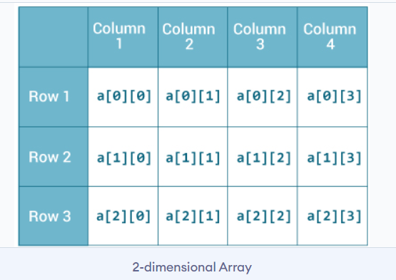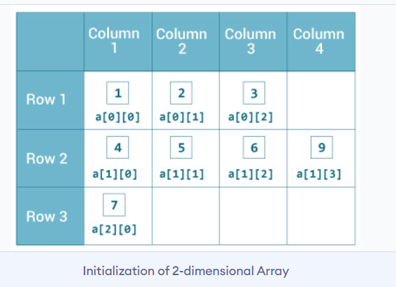 Here, we have created a multidimensional array named a. It is a 2-dimensional array, that can hold a maximum of 12 elements,