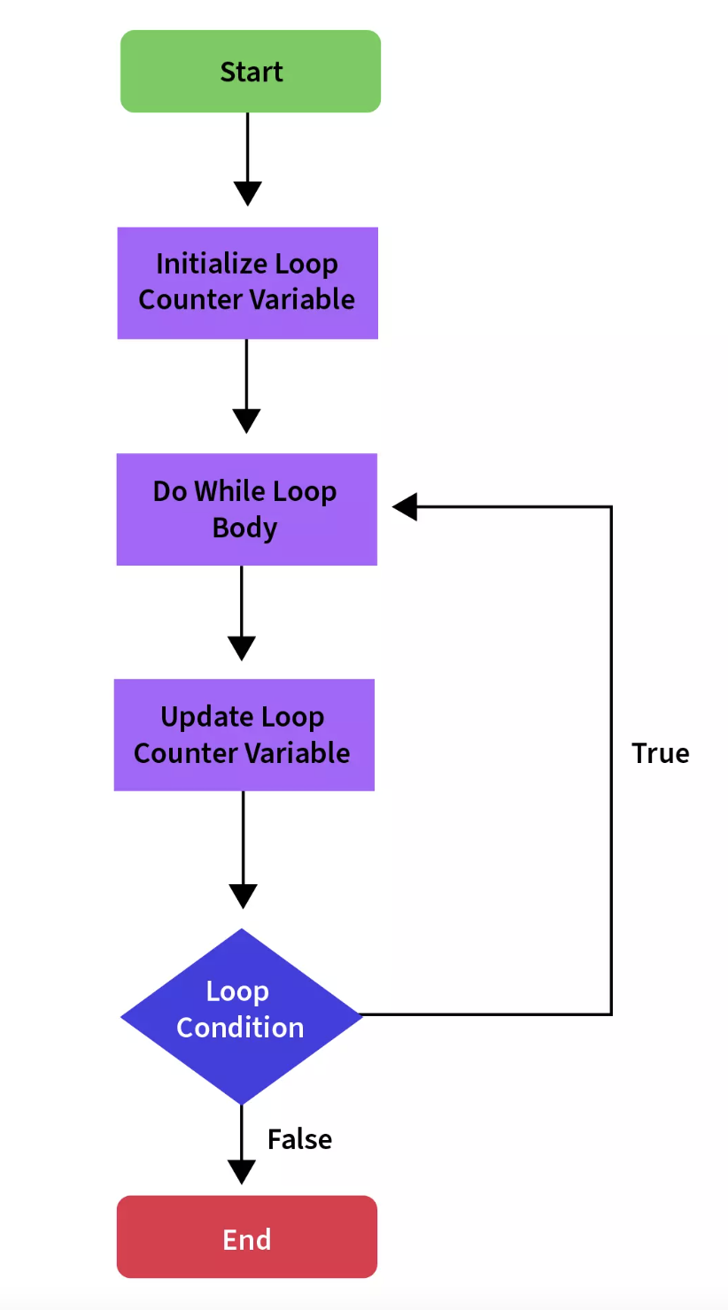 In the above flow diagram of a do-while loop, we also initialize a counter variable, but instead of checking the loop condition at the start, the body of the loop is executed at least once along with updation of the counter variable. After the completion of the loop body, we check the loop condition and continue to execute the loop body till the condition is false when we come out of the loop and execute the rest of the code.