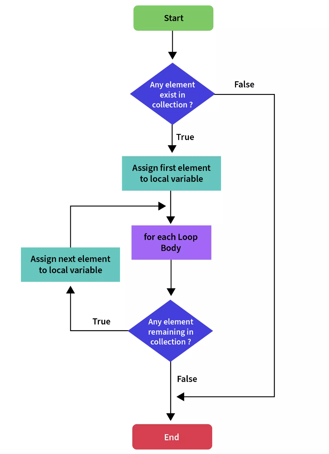 Let's see the execution flow of the for-each loop statement in a flow diagram: