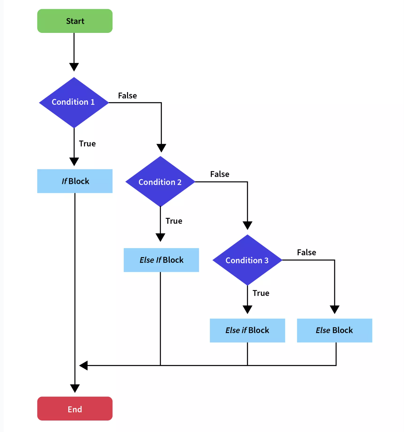 As you can see in the above flow diagram of the if-else ladder, we execute the if block if the condition is true, otherwise if the condition is false, instead of executing the else block, we check other multiple conditions to determine which block of code to execute. If none of the conditions are true, the last else block without any if condition, if present, is executed.