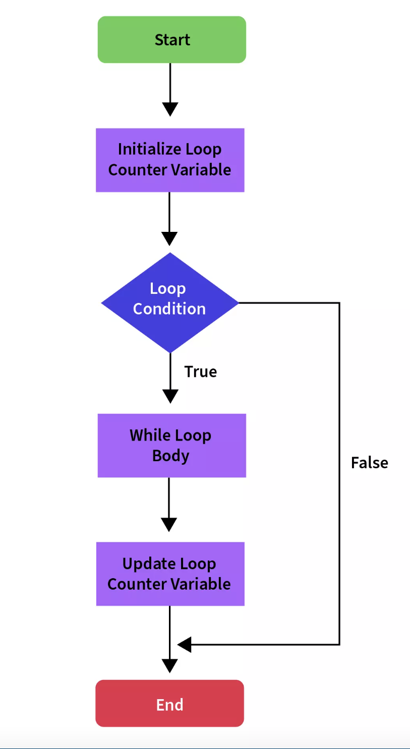 In the above flow diagram of a while loop, we initialize a loop counter variable. After that, we check the loop condition and if it's true, then the body of the loop is executed followed by the updation of the counter variable. The control then again switches back to the loop condition and the cycle continues till the condition is false and we execute the statements outside the loop body.