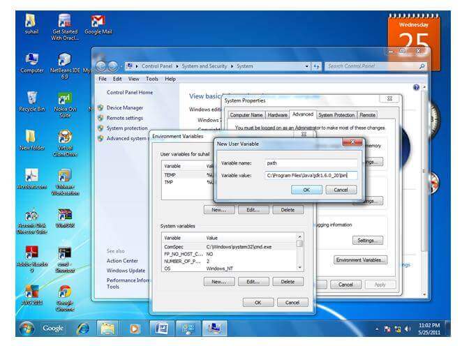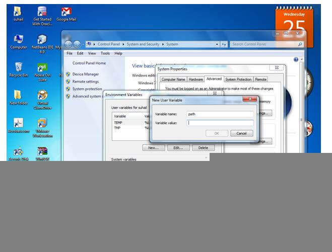 1. Right click on This PC select properties -> select advanced tab ->select environment variables ->select new tab of user variable -> variable name as path -> value as path from java bin folder-> ok -> ok -> ok