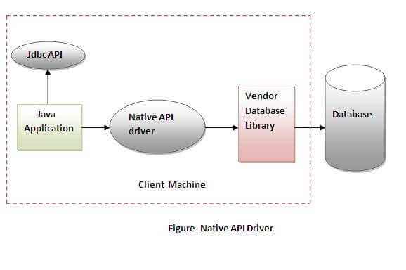 The Native API driver uses the client-side libraries of the database. The driver converts JDBC method calls into native calls of the database API. It is not written entirely in java.