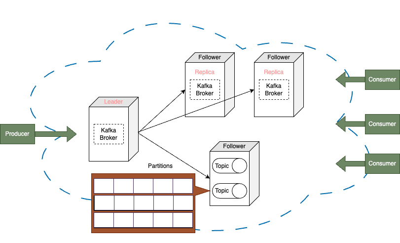Behind the scenes, these brokers work together to make sure that your events are stored reliably. There will be one broker that will act as a leader, and all other brokers will act as followers. Each of these brokers hosts Kafka topics, and each Kafka topic stores events in partitions. The leader will handle all read and write requests for the partitions, while followers will passively replicate leader's data. This way, Kafka can achieve high availability and fault tolerance.