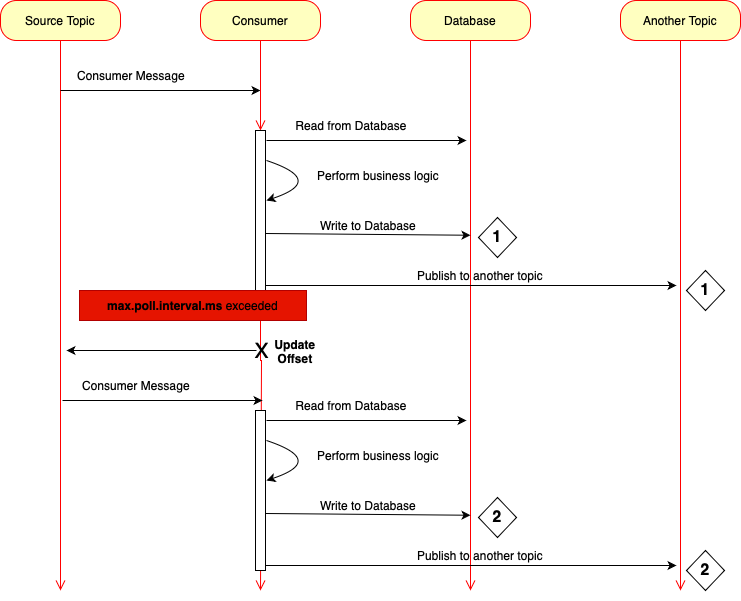 It will again read from the database, start processing its main logic, and it will again write to the database, and at the end it will publish a new message to another topic. But this time it will be able to complete all the business logic in time and it will update partition offset. This will mean that this message is consumed successfully. But look what happened. We processed only one message, but there are two records in the database and we published two messages to another topic. And this is a big problem because if these are payment transactions, there was only one message with request to pay. But our Kafka consumer made two payments, so we need to prevent it.