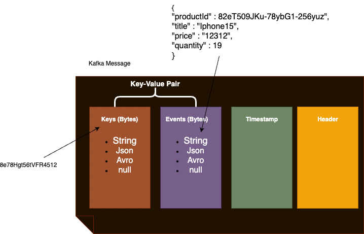 So you can think of Kafka message as a key value pair, where both key and the value can be of different data types, including null value. An example of a key could look like alphanumeric string of characters, for example, or it can have a custom format.