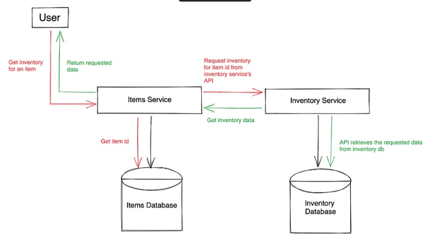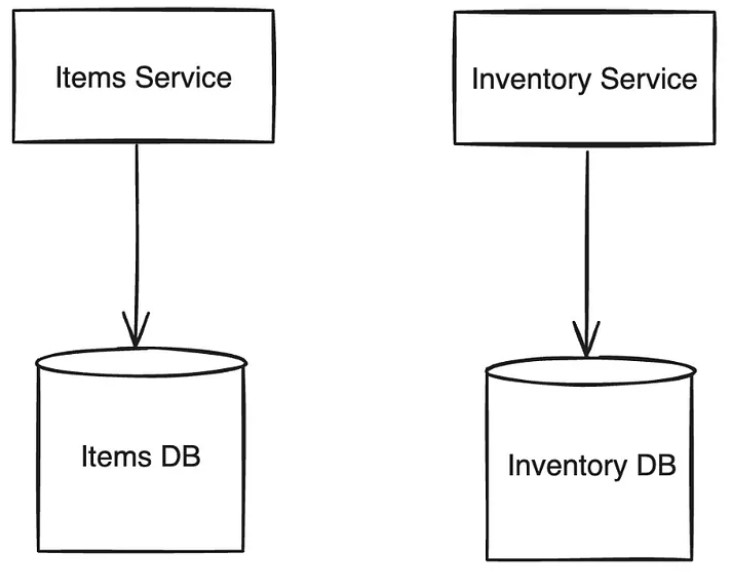 To solve this problem, we can use the database per service pattern. An items database will store items data and another inventory database will store inventory data. Items service will connect to items db and inventory service will connect to inventory db. This way, if there is any issue in items service, inventory service will still keep running.